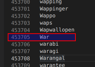 Even the tiniest difference in the data will result in a vastly different root hash. For instance, of the 466,550 words in the above test file one will be removed: ‘war’ from line 453,705 (Lennon would be proud!)